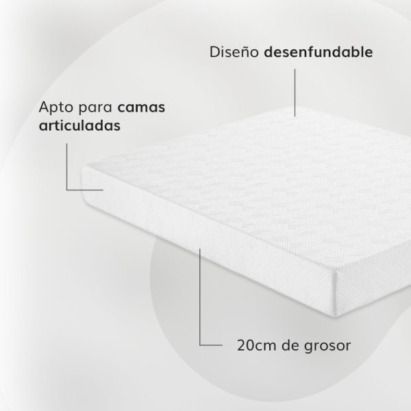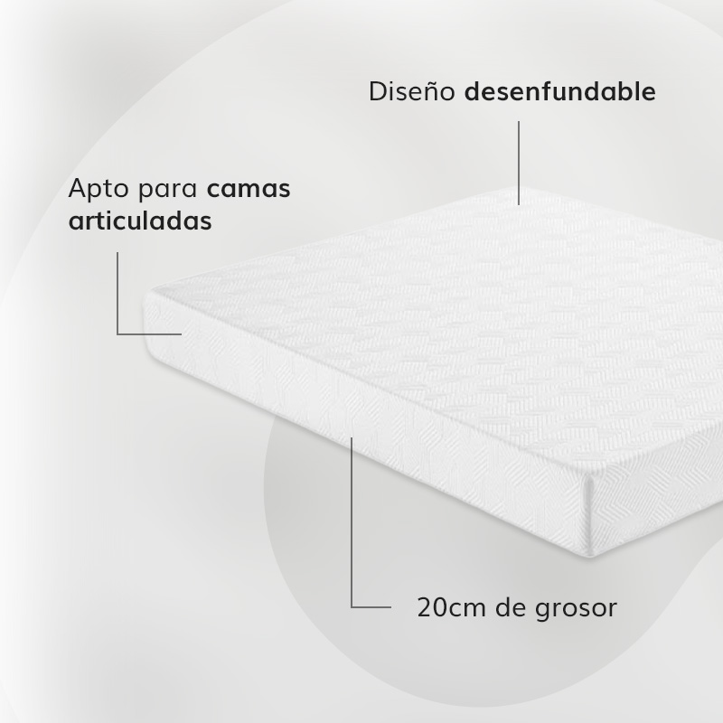Este Colchón Desenfundable combina lo mejor en tecnología de descanso con materiales de alta calidad para brindarte un sueño de calidad. Experimenta el lujo y la comodidad en tu hogar con este colchón de 20 cm de grosor. ¡Tu bienestar merece lo mejor!